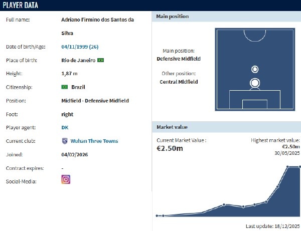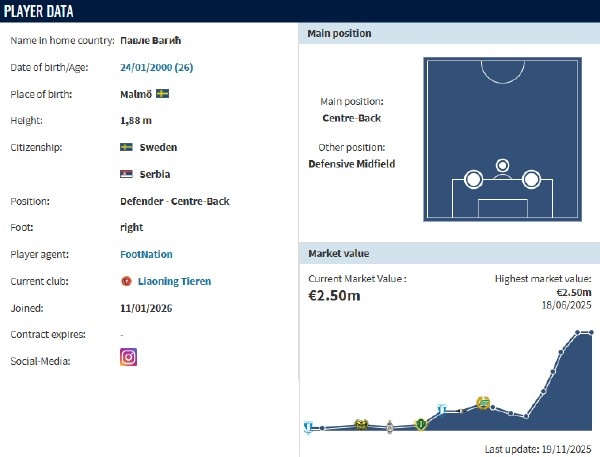 新赛季辽宁铁人的外援在德转上的总身价会是中超最高,这不只是因为热菲尼奥(德转评估身价450万欧,本赛季中超第一),还有德转身价高达250万欧元的瑞典中卫瓦吉奇。